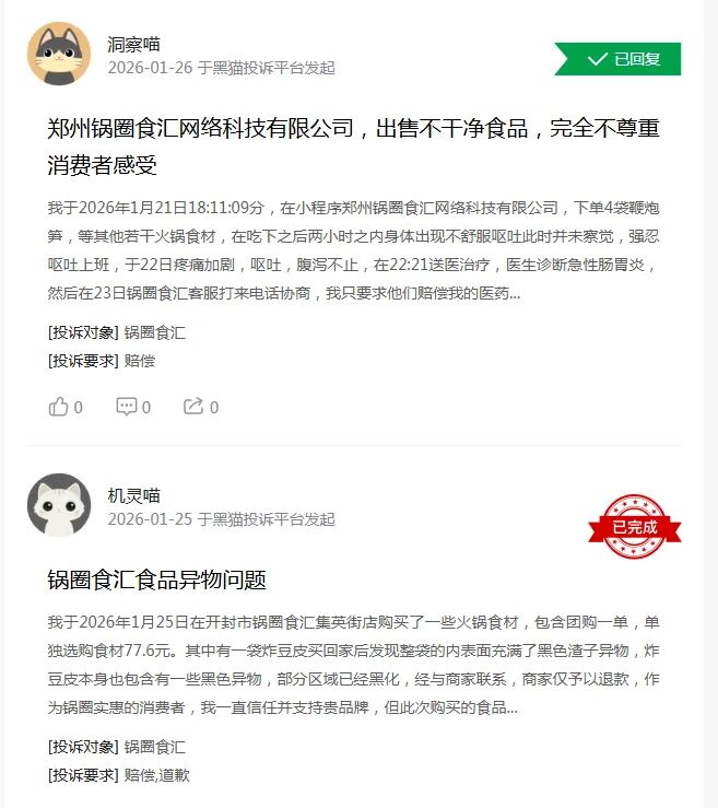 2025年,公司估计收入77。5亿元—78。5亿元,同比增加19。8%—21。3%;估计实现净利润4。43亿元至4。63亿元,同比增幅83。7%至92%。做为社区餐饮供应链品牌,锅圈从打“正在家吃暖锅、烧烤”场景,公司营收正在2022年达到71。73亿元高点,并于次年登岸港股。但上市首年业绩便呈现“变脸”,跟着公共卫生事务竣事,居家暖锅需求回落,2023年公司收入下滑15%至60。94亿元;2024年略有回暖,营收增至64。7亿元,但仍未回升至2022年的峰值程度。年报显示,2023年、10150家,呈现必然下滑。2025年,创始人杨明超喊出要再开1万家店的豪言,截至昔时岁尾,公司门店数量达到11566家,较岁首年月添加了1416家。值得留意的是,锅圈门店总数还逗留正在10761家,相当于第四时度3个月净增门店805家,跨越了前9个月总和,扩张提速。跟着门店规模扩大、店均收入提拔,叠加运营效率优化,配合鞭策了锅圈2025年焦点业绩目标的增加。不外,亮眼业绩难掩锅圈运营存正在的短板,其高速扩张背后的加盟模式现患正持续。据悉,自营门店仅十余家,这种模式虽支持了企业快速扩张,却也带来了门店管控难度大、食物平安事务易发等问题。就正在近期的1月15日,杭州一名消费者通过外卖平台正在锅圈食汇订购的食材中,发觉一盒出产日期为2026年1月12日、保质期仅2天的老豆腐。经多方协商,门店最终补偿该顾客300元。针对此事,涉事豆腐属于公司“授权答应门店自行采购并发卖的商品品类”,根据相关合同取,此类“自采商品”的采购、储存、办理及售后义务,应由做为运营从体的加盟门店自行承担。这一回应,将品牌总部取加盟门店的义务进行了切割。据报道,2025年11月,白山一名消费者爆料其正在锅圈食汇采办的毛肚中发觉一只苍蝇;同年10月,有网友正在“七珍菌菇荟”产物中发觉;9月有消费者赞扬,锅圈食汇的暖锅底猜中呈现蛆虫,监管部分介入协调。截至目前,黑猫赞扬平台上,锅圈食汇的相关赞扬达396起,多涉及食材异物、变质、食用后腹泻等问题。